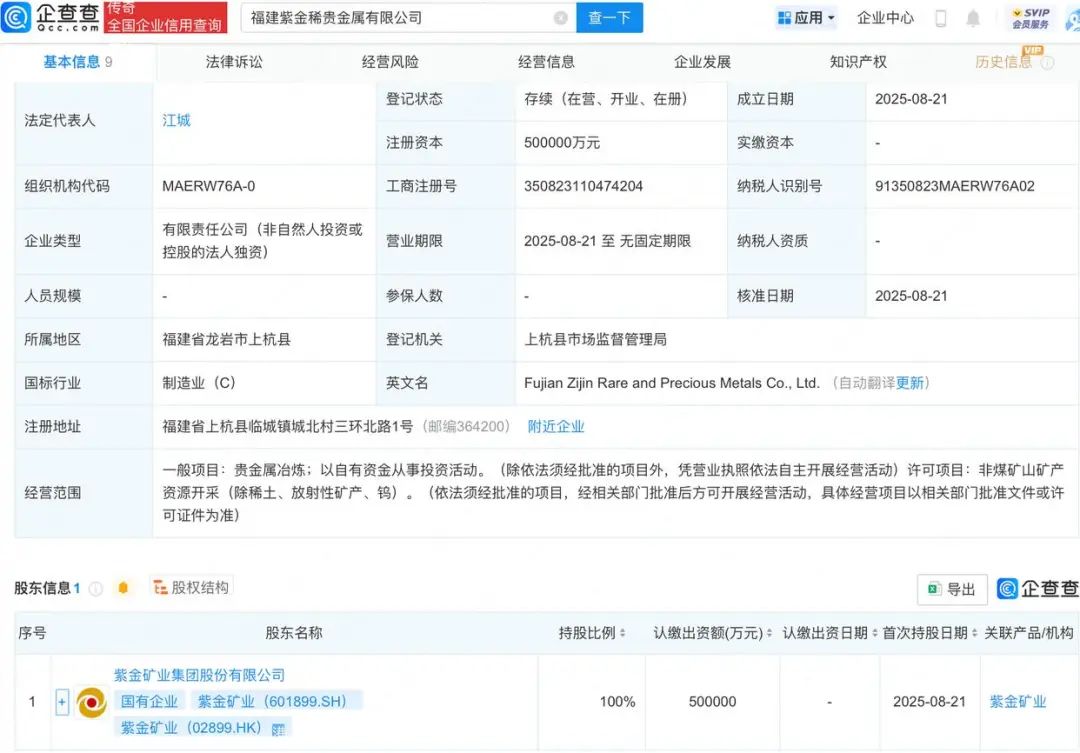 企查查APP显示,近日,福建紫金稀贵金属有限公司成立,注册资本50亿元,经营范围包含:贵金属冶炼;以自有资金从事投资活动等。企查查股权穿透显示,该公司由由紫金矿业(601899)100%持股。